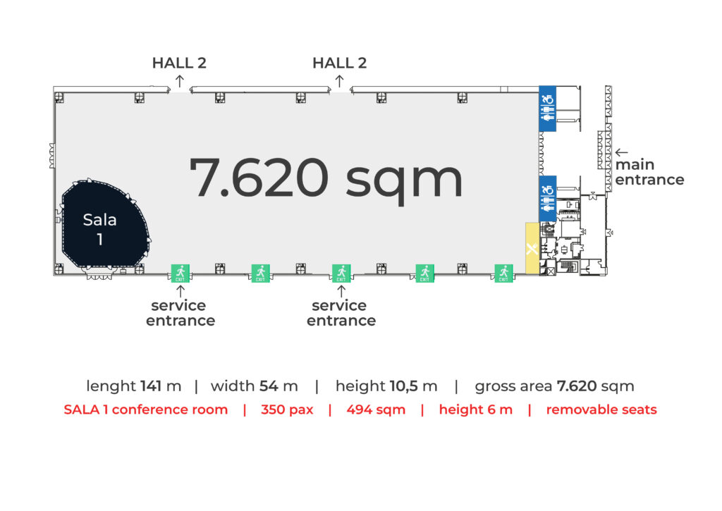 The logistic is ideal for both exhibitors, who benefit from two portals leading to the adjacent outdoor area, and visitors, who have direct access to the main entrance. The pavilion features 23 restrooms, renovated in 2024, a fixed refreshment area, and a fully soundproofed hall measuring 350 square meters, accommodating up to 300 people. Natural lighting is provided by 48 skylights that can be completely darkened if needed, along with 79 dimmable LED lamps.