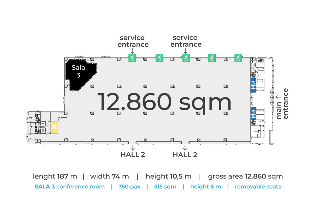 Thanks to its 12 pillars, Hall 3 offers great flexibility, allowing for any layout and floor plan to be adapted. In addition, the adjacent outdoor space can be integrated into the pavilion, further increasing utilization possibilities. The pavilion is equipped with 12 sanitary facilities, a fixed refreshment area, and a fully soundproofed 350-square-meter hall that accommodates up to 300 people. Natural lighting is provided by 88 skylights, which can be completely darkened if necessary, and by 167 dimmable LED lamps.