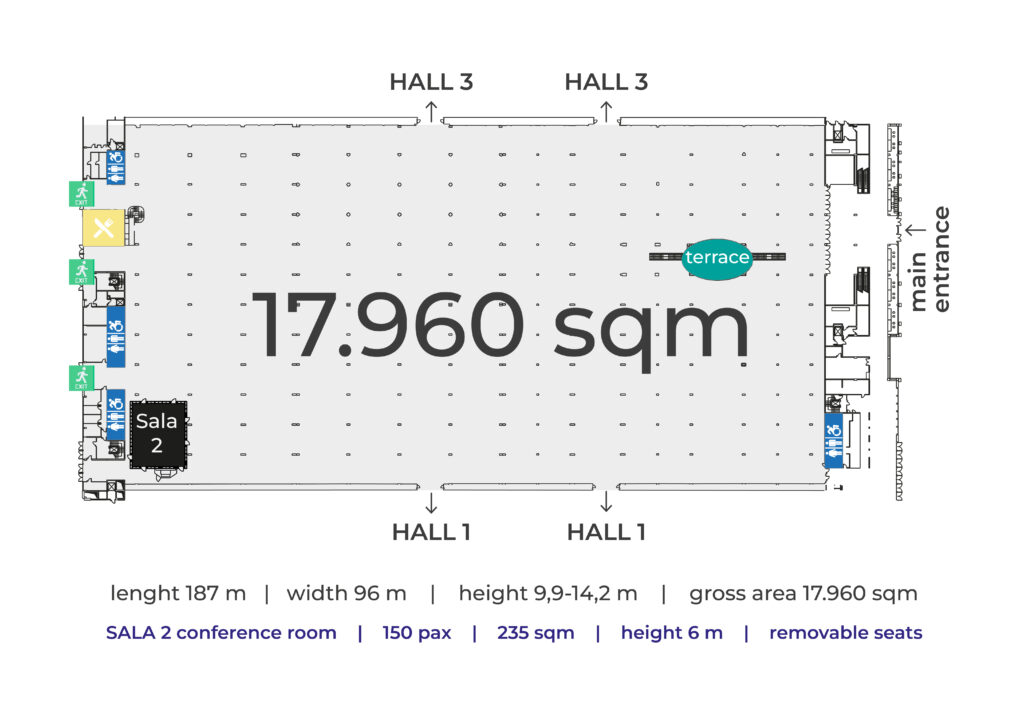Renzo Piano, durante il processo di recupero e trasformazione, ha deciso di mantenere i tratti industriali del padiglione, inclusi il bosco di colonne, valorizzandone la capillarità per integrare i quadri elettrici, evidenziati dal colore giallo. Il padiglione beneficia di un’ottima illuminazione naturale, che crea eccezionali giochi di luce durante qualsiasi evento organizzato al suo interno. Inoltre, il padiglione dispone di blocchi bagni su entrambi i lati, un punto ristoro, una lounge sopraelevata e una sala di 180 mq.